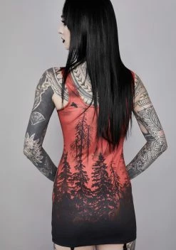 where will you be when the blood moon rises? This bodycon mini dress has lace-up details on the front, a square neckline, and a forest print all over.