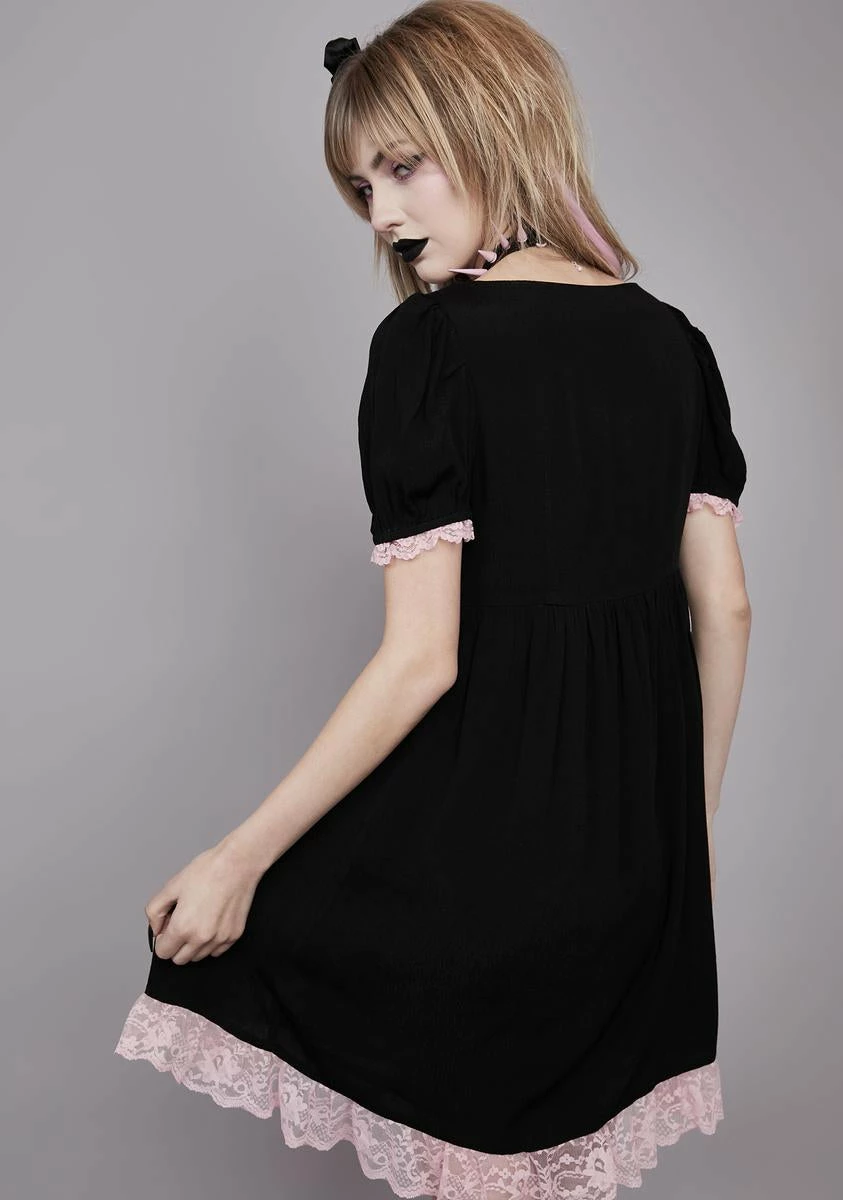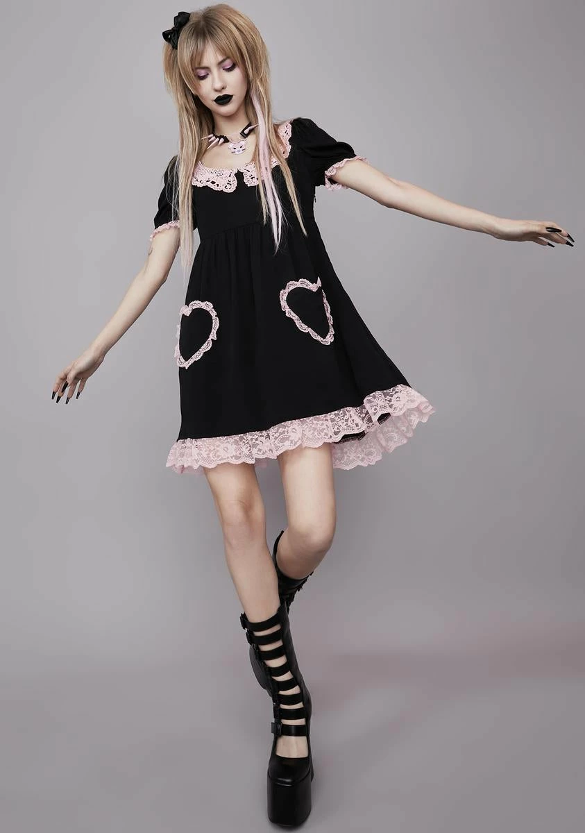 cuz I’m dripping with sadness. Be tragic and beautiful in this babydoll dress that has a crochet lace collar, short puffy sleeves, heart shaped lace detailed front pockets, a side zip closure, and lace trim.