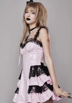 cuz my joy melts away every day. Show that temporary cheer in this mini dress that has a shiny vinyl construction, a structured bust, a tiered ruffled skirt, lace trim, adjustable shoulder straps, a satin bow detail in the back, and a back hook zip closure.