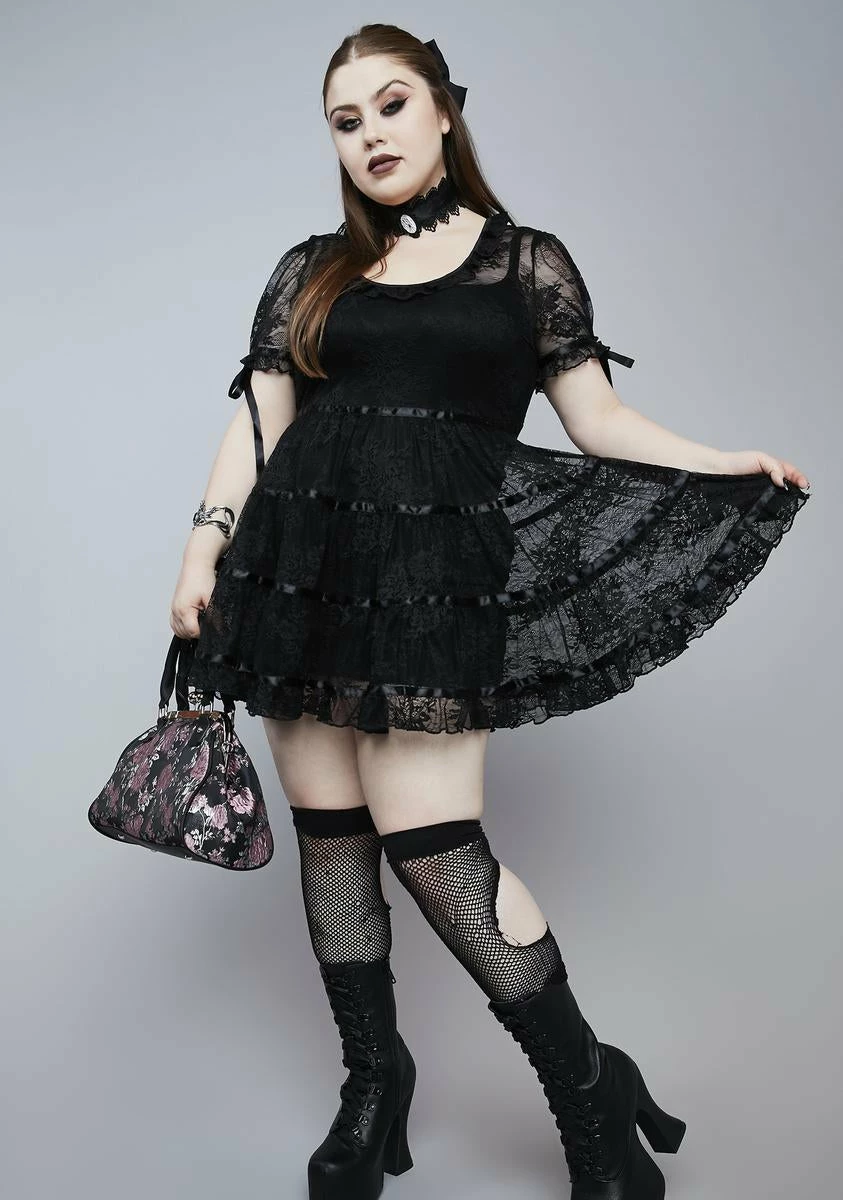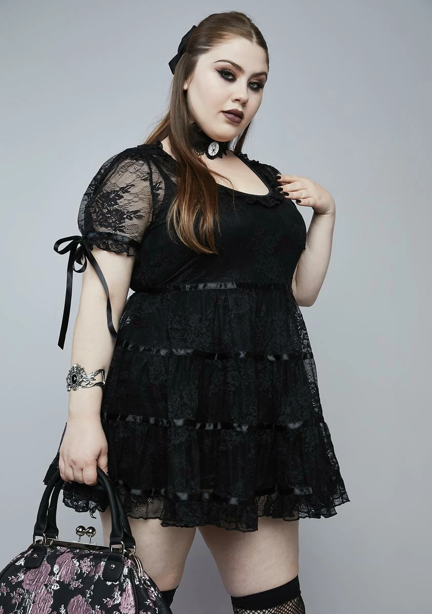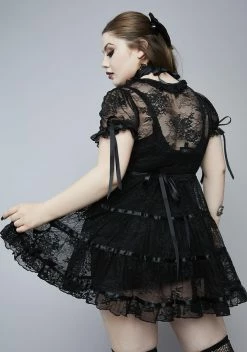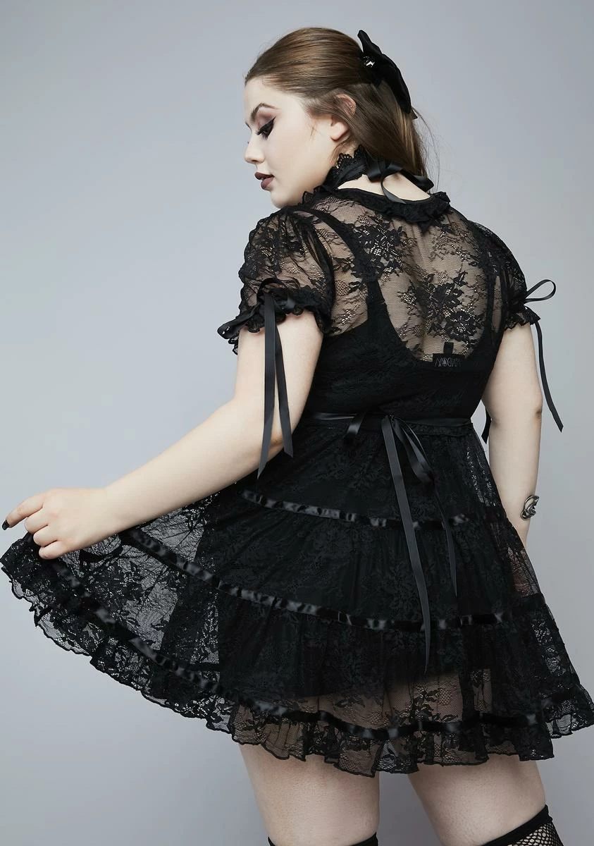 because thereâs a haunting at the tip of the town. Itâs hide and seek at the hill house in this mini dress with a lace overlay, short puff sleeves with satin ribbon ties, frilly trim at the hem, and satin trim stripes on the skirt with a tie in back.