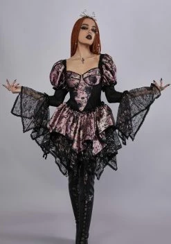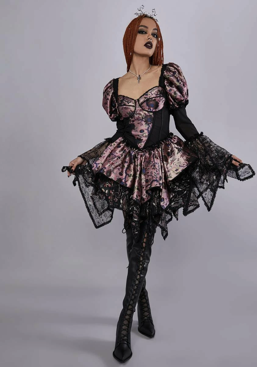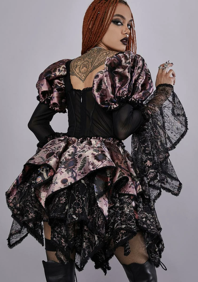 now we’re bound together. Keep your promises in this mini dress that has a satin construction with a brocade floral design, a sweetheart neckline, long sleeves with puffy shoulders and flared lace cuffs, a structured mesh bodice, an asymmetric ruffle hem, and a zipper closure at the back.
