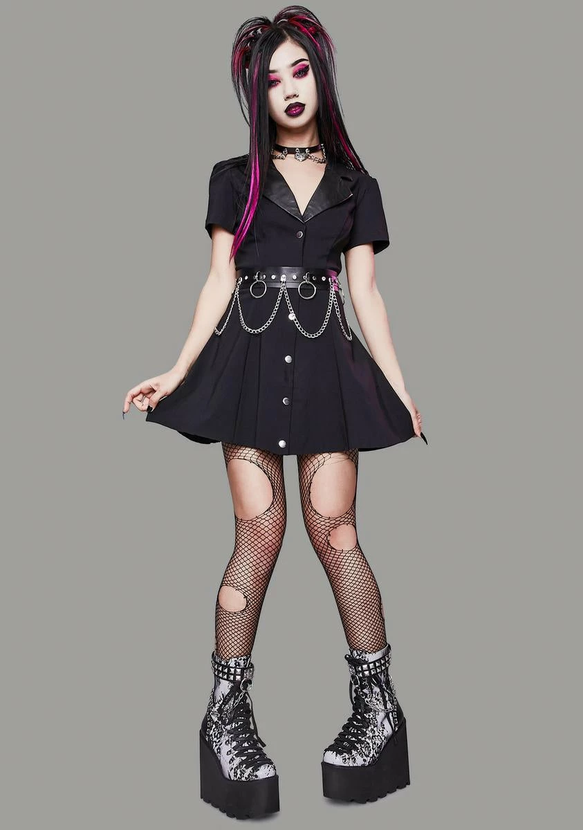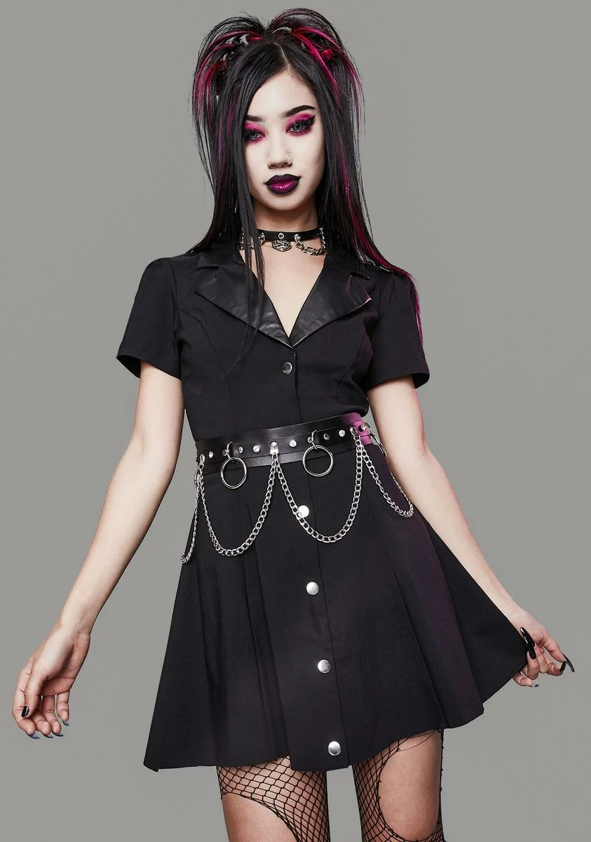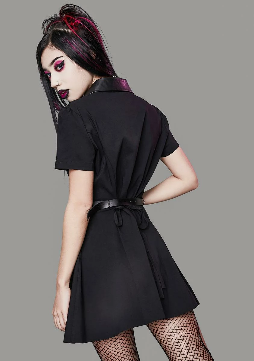 cuz you’re not always innocent. This short sleeve shirt dress has a vegan leather revere collar, snap button closures on the front, a flared fit, and a belted waistline with chain and O-ring hardware.