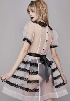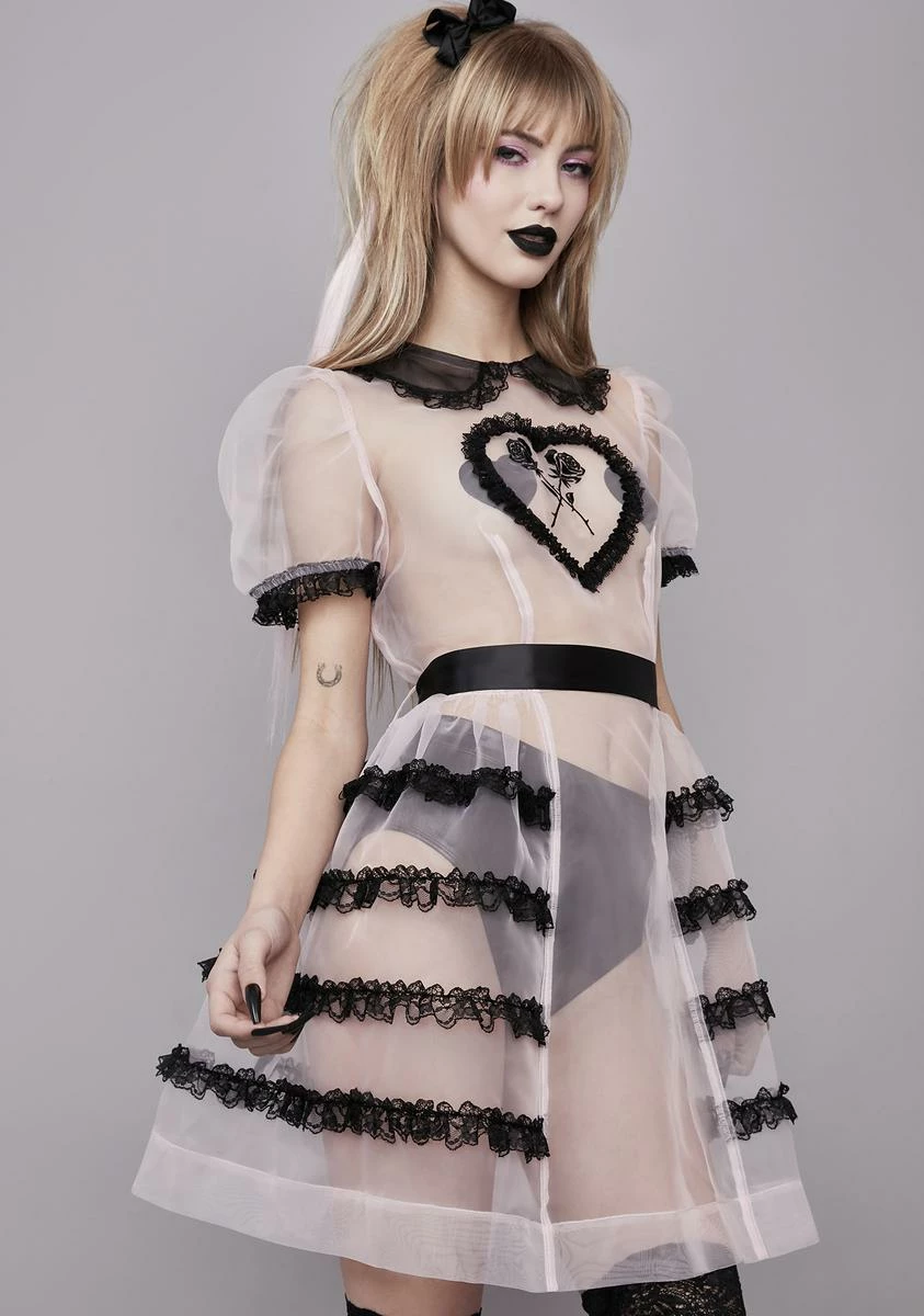 cuz the melodies of midnight keep ’em in a trance. You’re a sound in the distance with this sheer organza babydoll dress that has a contrast colored peter pan collar,short puff sleeves, and ruffled tiered lace trim,a heart design with rose graphics on the front, and button closures and a ribbon tie on the back.