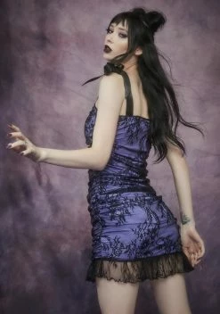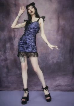 cuz wherever you go, evil follows. Pray for darkness in this bewitching mini dress that has a floral lace overlay with ruched detailing, satin bow straps, and a sweetheart neckline with a cross charm.