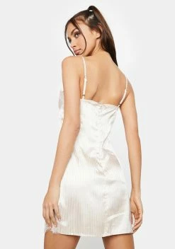 has a satin construction, a pinstripe design, adjustable cami straps, eyelash trim along the neckline, and side split hem details with lace paneling.