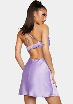 it was meant to be. This mini dress comes in a satin construction, with a square neckline, ruching details, adjustable cross back spaghetti straps, a back zip closure, and a back cut out.