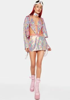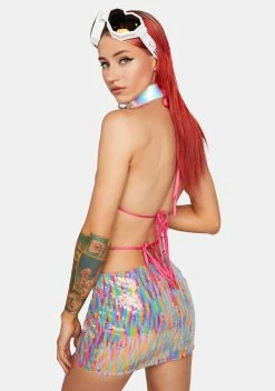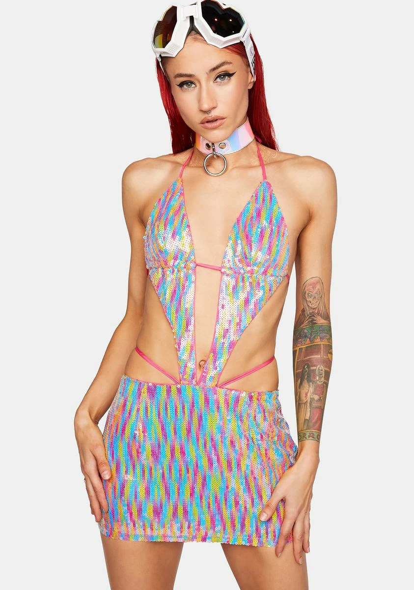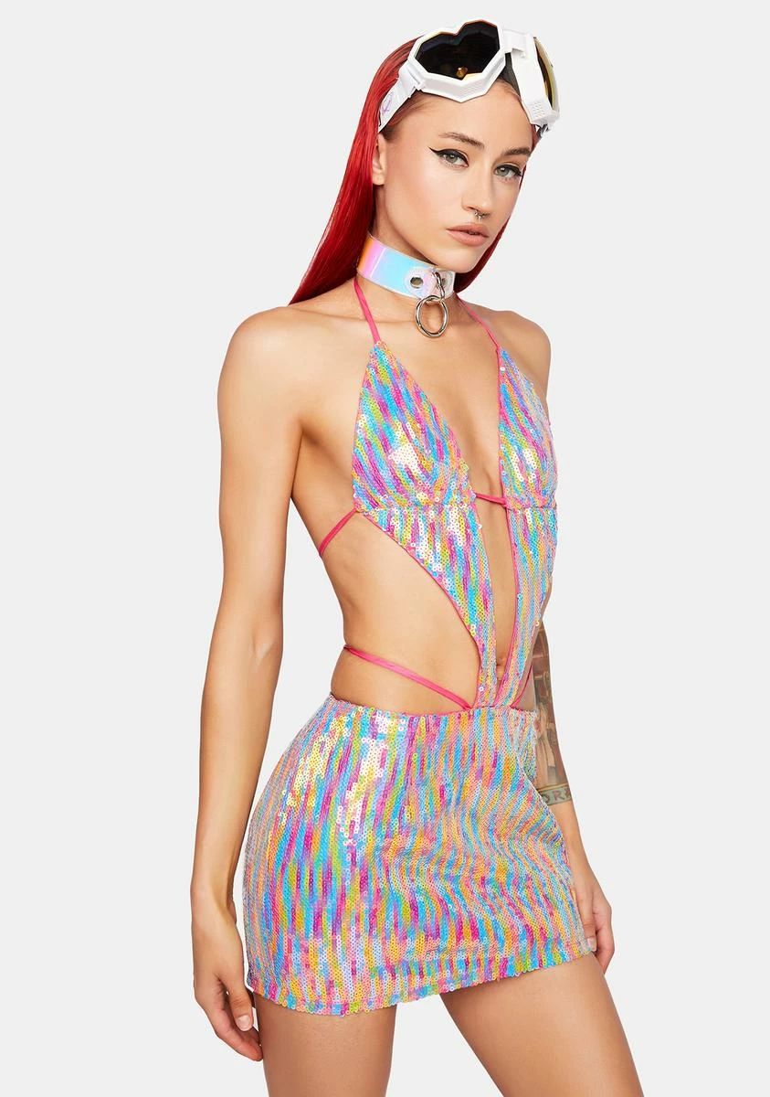 will fulfill all your fantasies, babe! This strappy cut-out mini dress has a rainbow sequin construction, a plunging neckline, and adjustable tie back closures.