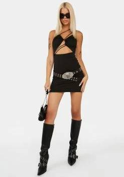 cuz you’re ready for a good time. This mini dress has asymmetrical shoulder straps and chest cutouts, a bodycon fit, and a stretchy construction.