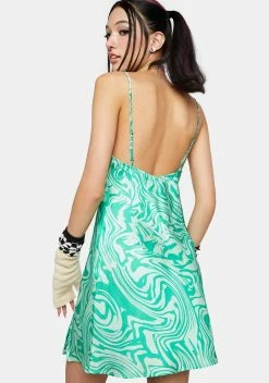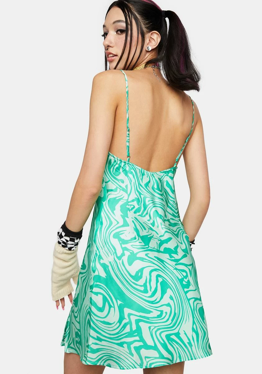 has a swirl print all over, spaghetti straps, a cowl neckline, and a side slit.