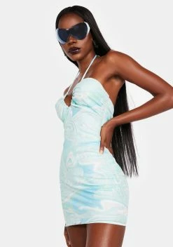 all eyes on me. This mini dress has a mesh construction, an all over swirl print, a halter neckline, ruching at the bust, and a cutout at the back.