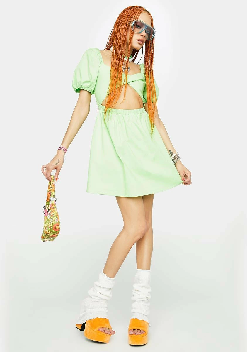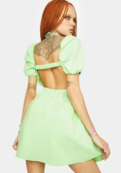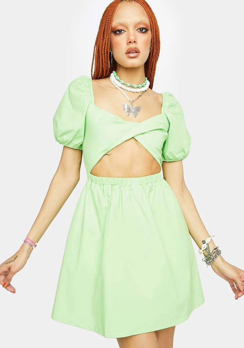 you’re on a high. This babydoll dress has puff sleeves, a triangle cutout across the chest, an open back design, and a fit n’ flare silhouette.