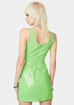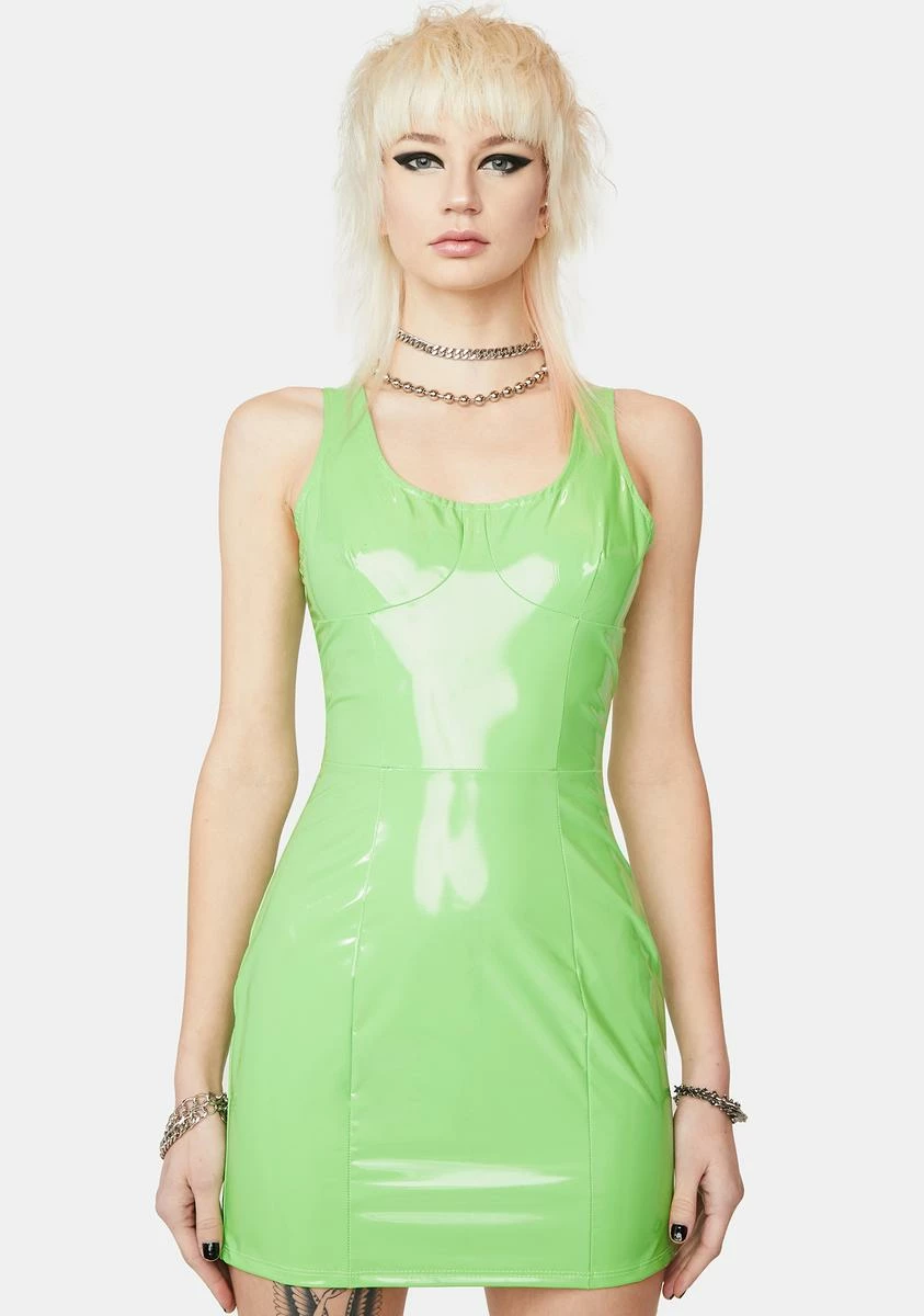 and you can’t be bothered! This shiny vinyl mini dress has a bodycon fit, shaped cup details, and a back zip closure.