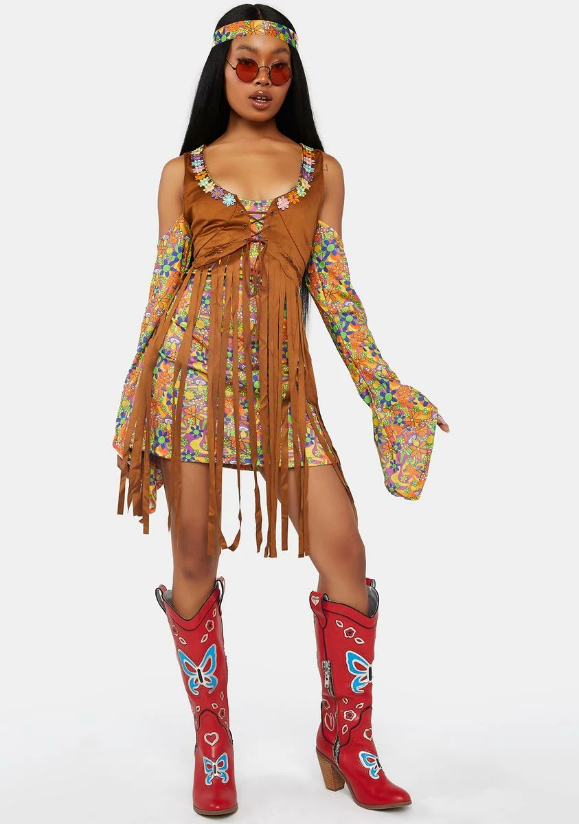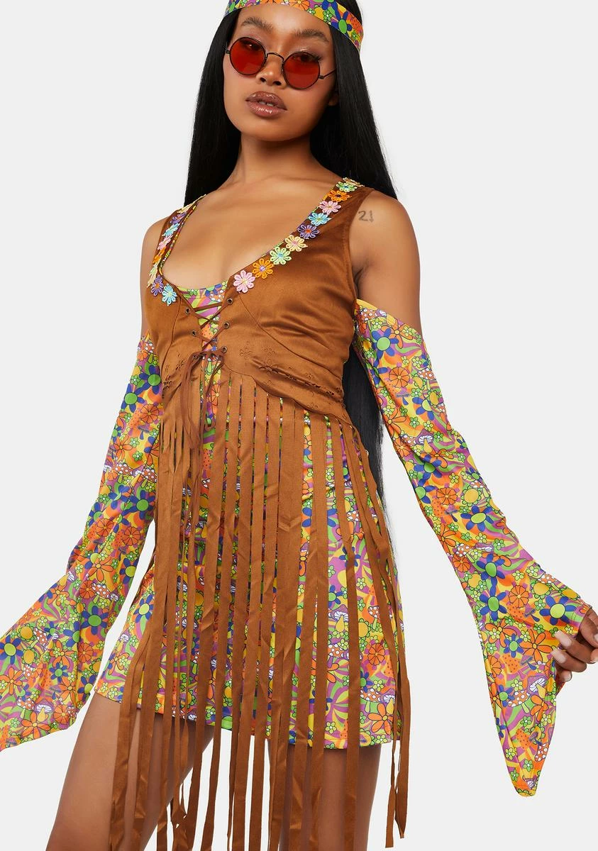 cuz make love not war. This costume set includes a mini dress with an all over floral pattern, faux suede fringe detailing, a lace up design, a scoop neckline, bell sleeves, cut out detailing, embroidered flowers, and a matching bandana.