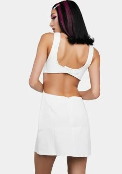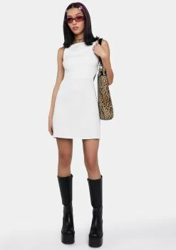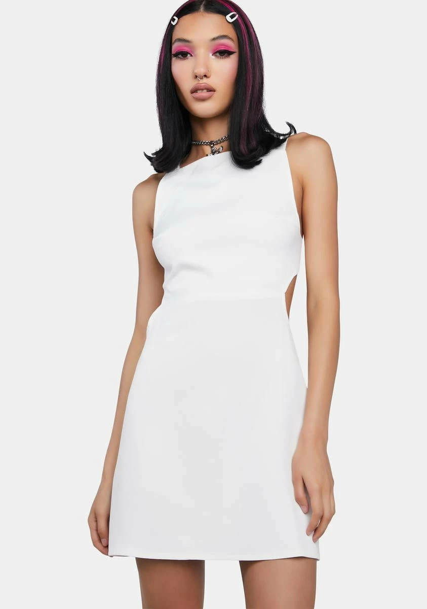 cuz you forgot your manners! This mini dress has a high neckline, an A-line silhouette, a back zip closure, and an open back cutout with a buttoned strap.