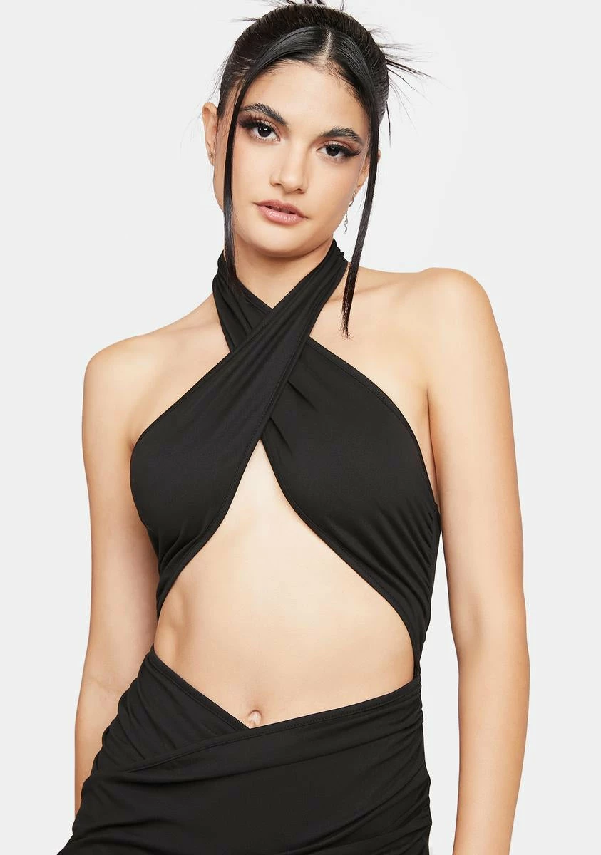 cuz they wait for your arrival, babe! This mini halter dress has a cut-out design, a ruched construction, and a bodycon fit.