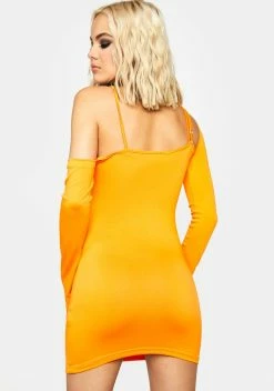 comes in a cut out construction, with asymmetrical sleeves, and a mini bodycon fit.