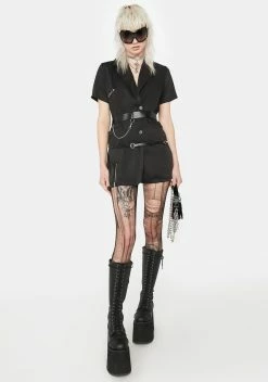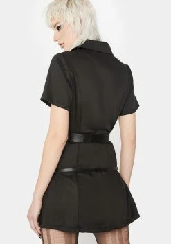 cuz I only love myself. Make a statement with this mini dress that has a collared neckline, short sleeves, pockets, a double breasted front button design, safety pin and zipper detailing, and adjustable belt closures with metal ring chain hardware.