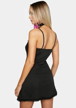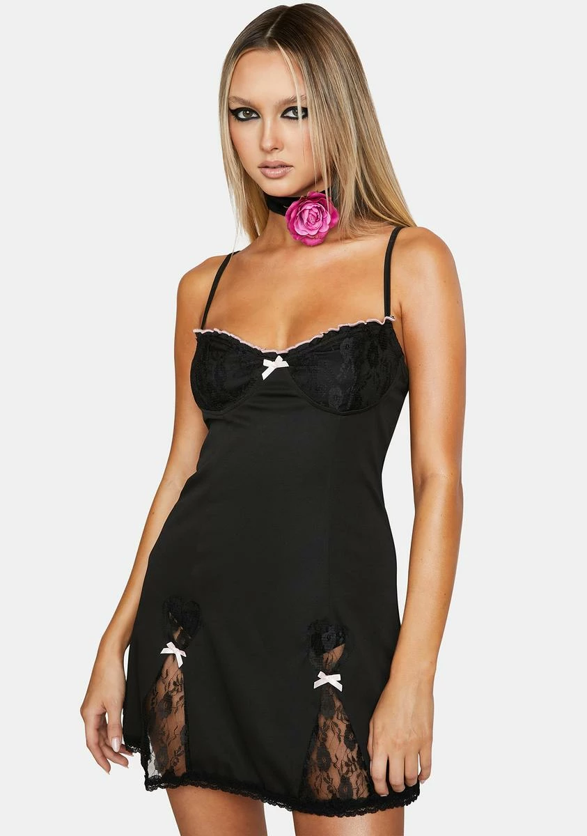 cuz give them a love bite. Make them melt with this slip dress that has a satin construction, shoulder straps, lace overlay on the bust, a sweetheart neckline, decorative bows, a heart shaped cut out design with a lace overlay on the hem, and a bodycon fit.