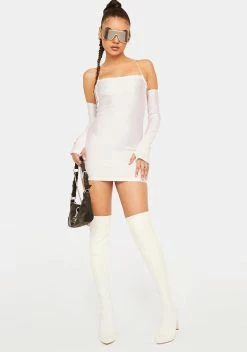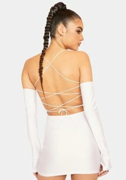 includes a bodycon mini dress with spaghetti straps that criss cross in back, a satin construction, and matching elbow length gloves.