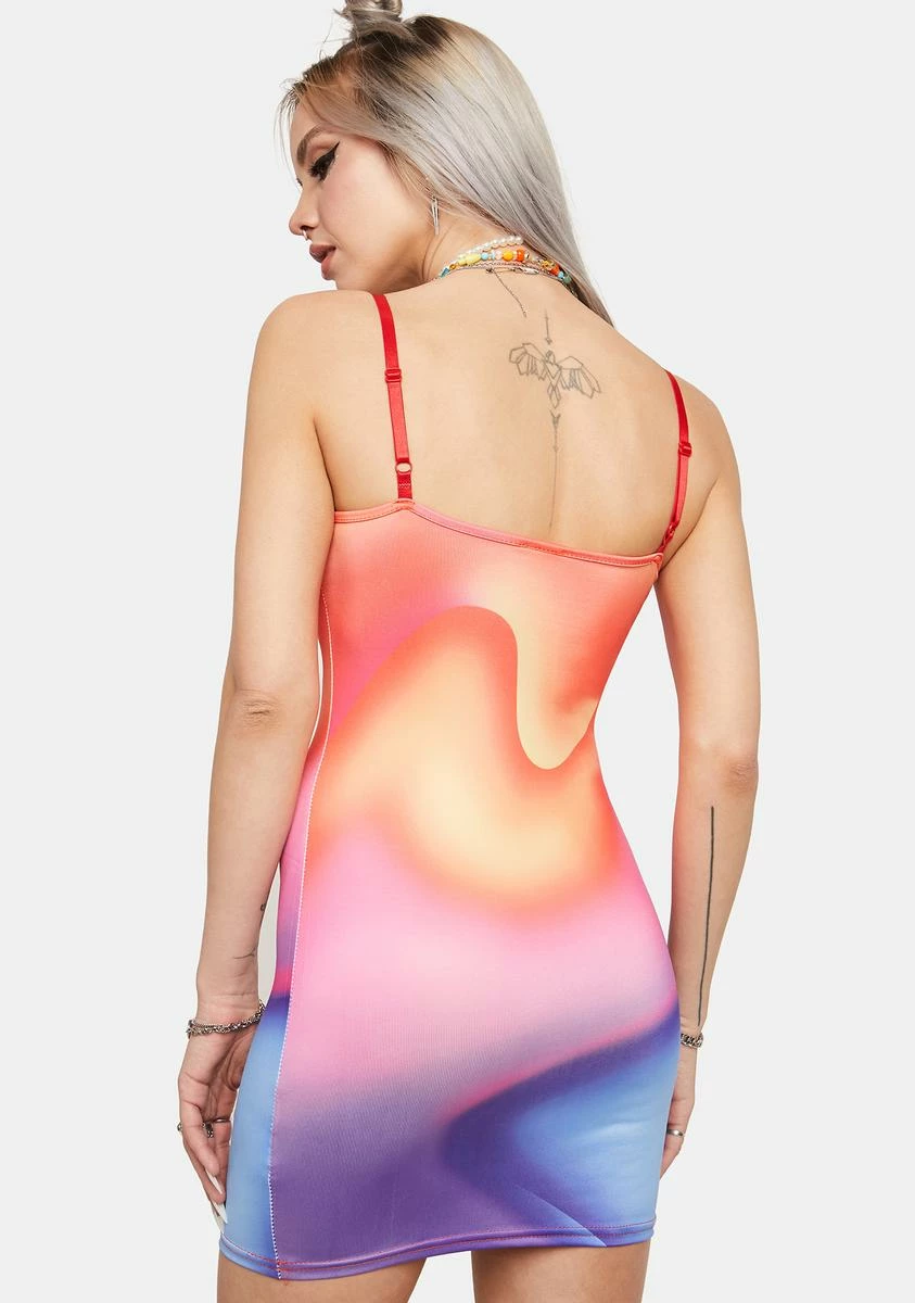 cuz there’s a party in my head. This mini dress has an ombre trippy color pattern, contrast colored adjustable spaghetti straps, a structured bust, and a bodycon fit.