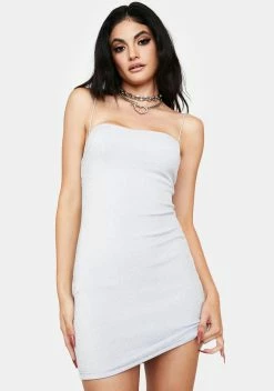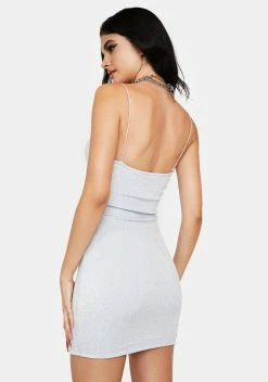 has a sparkle knit construction, spaghetti straps, a sweetheart neckline, and a bodycon fit.