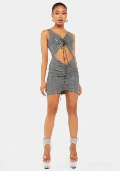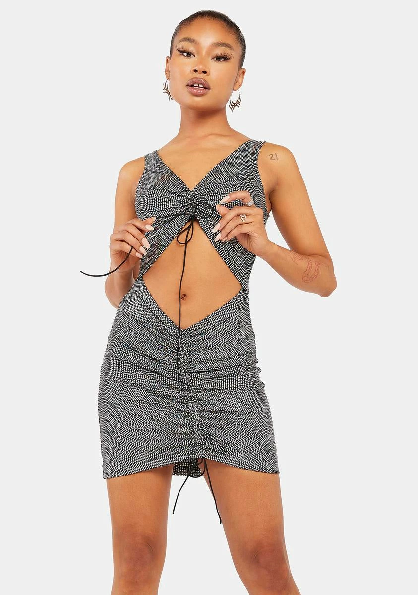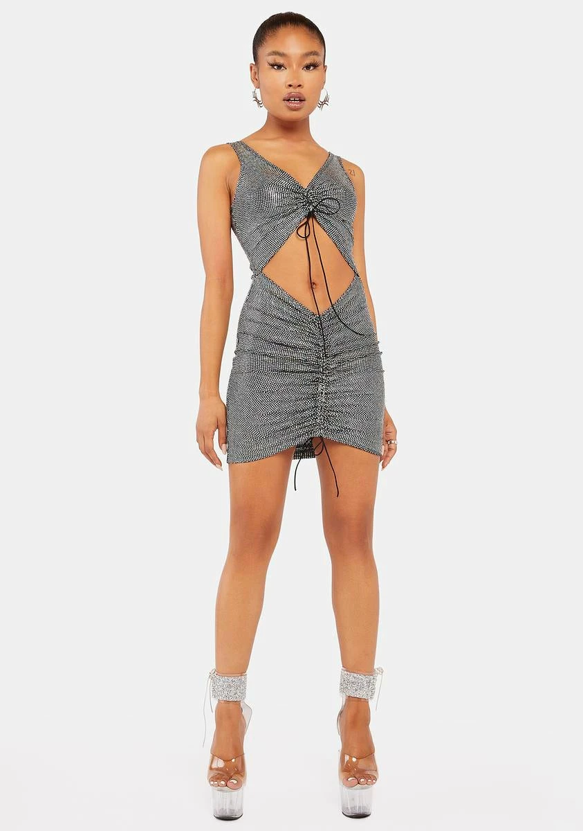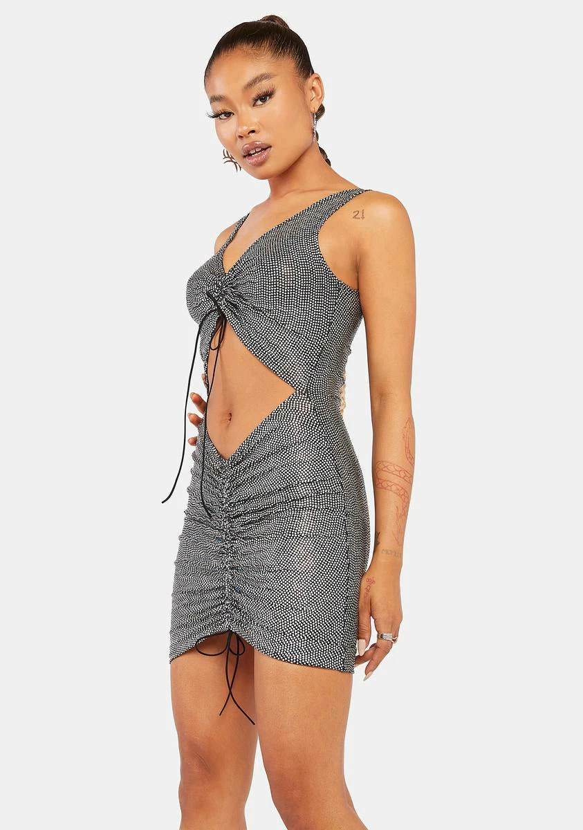 has a metallic holographic construction, a ruched design with adjustable drawstrings, a V-neckline, and a bodycon fit.