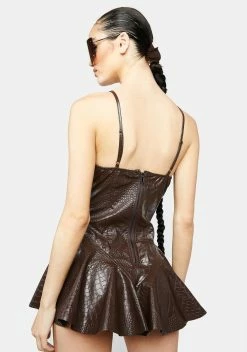has a vegan leather construction with an embossed crocodile texture, a bustier bodice, adjustable straps, and a fit & flare skirt.