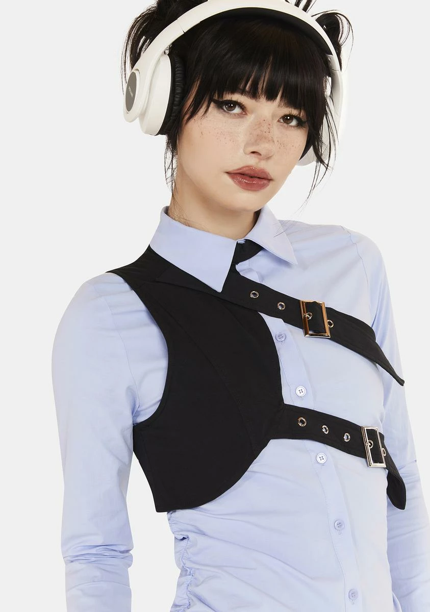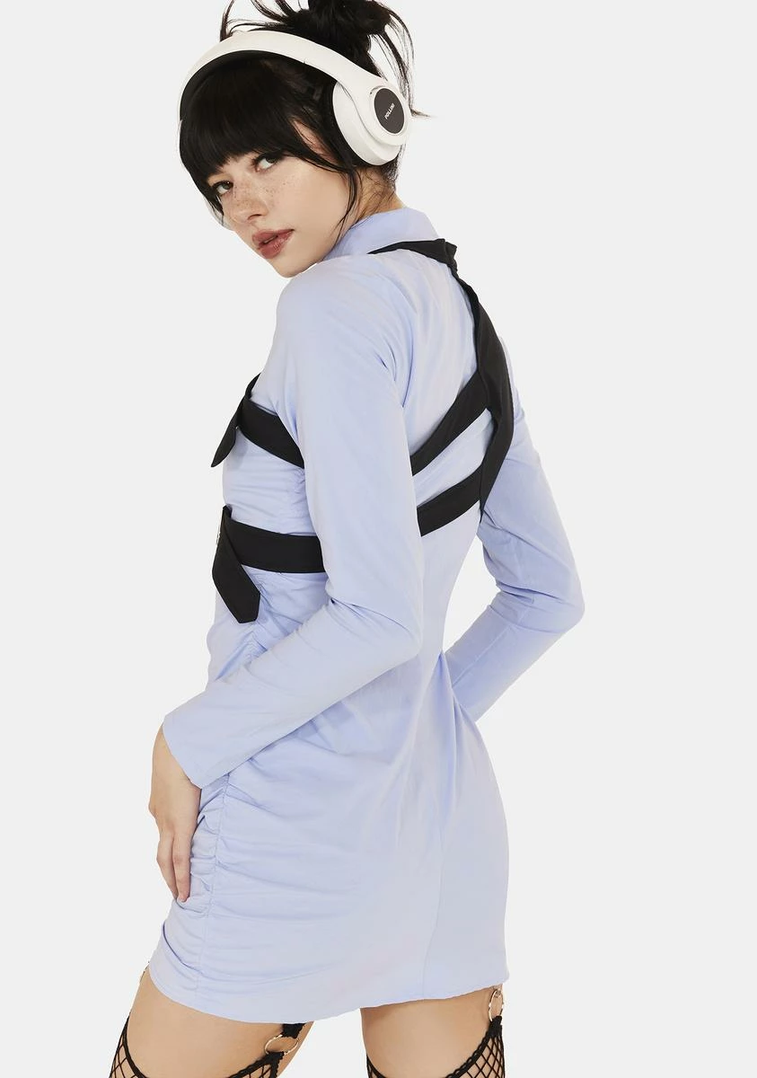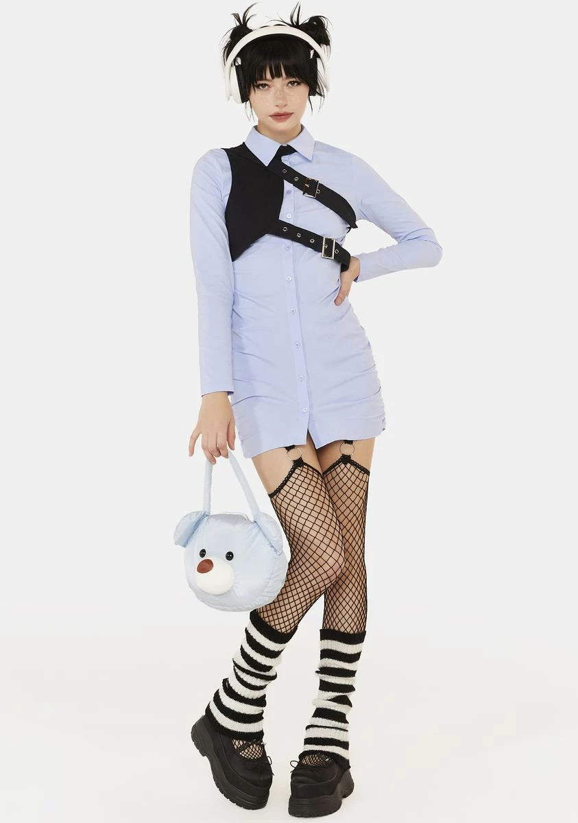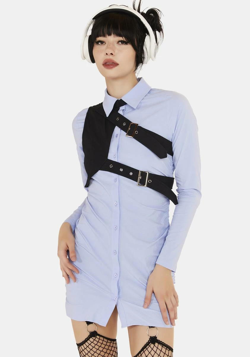 cuz it really ain’t that serious. This long sleeve mini dress has a classic shirt dress construction, a buckled harness-style accent at the shoulder, a classic collar, a front button placket, and ruching at sides.