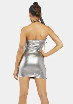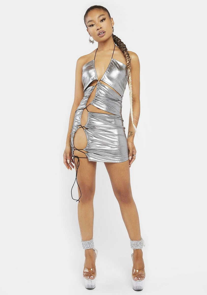 cuz the rhythm is getting to you. This mini dress has a metallic construction, asymmetrical side lace up design, ruched detailing, and a bodycon fit.