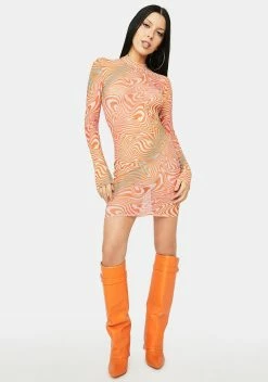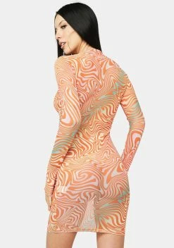 cuz you’re gonna tripp ’em out, babe. This mesh mini dress has a mock neckline, long sleeves, and a trippy swirl print all over.