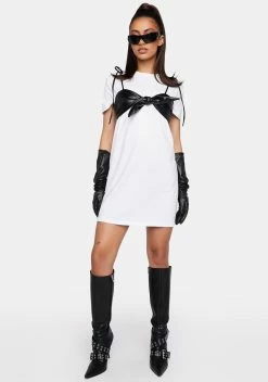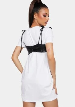 never fool me again. This t-shirt dress comes in an oversized fit, with a crew neckline, short sleeves, with a vegan leather bra overlay, knotted front, and shoulder strap tie closures.