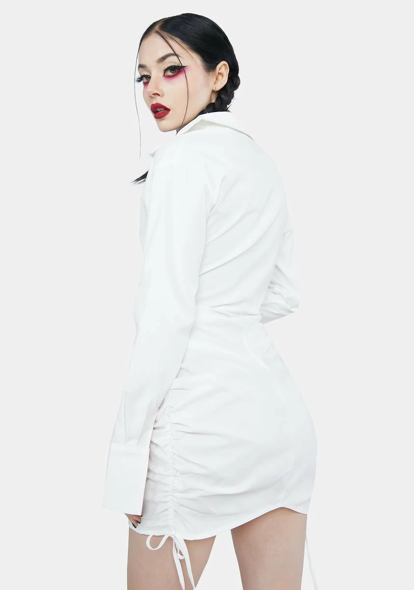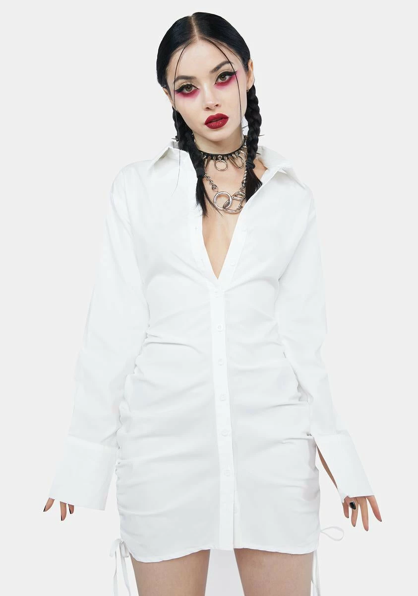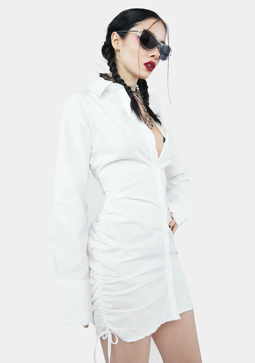cuz party at my house! This dress has a collared neckline, long sleeves, a ruched design with adjustable cinch ties at the sides, a plunging neckline, a bodycon fit, and a button down closure.