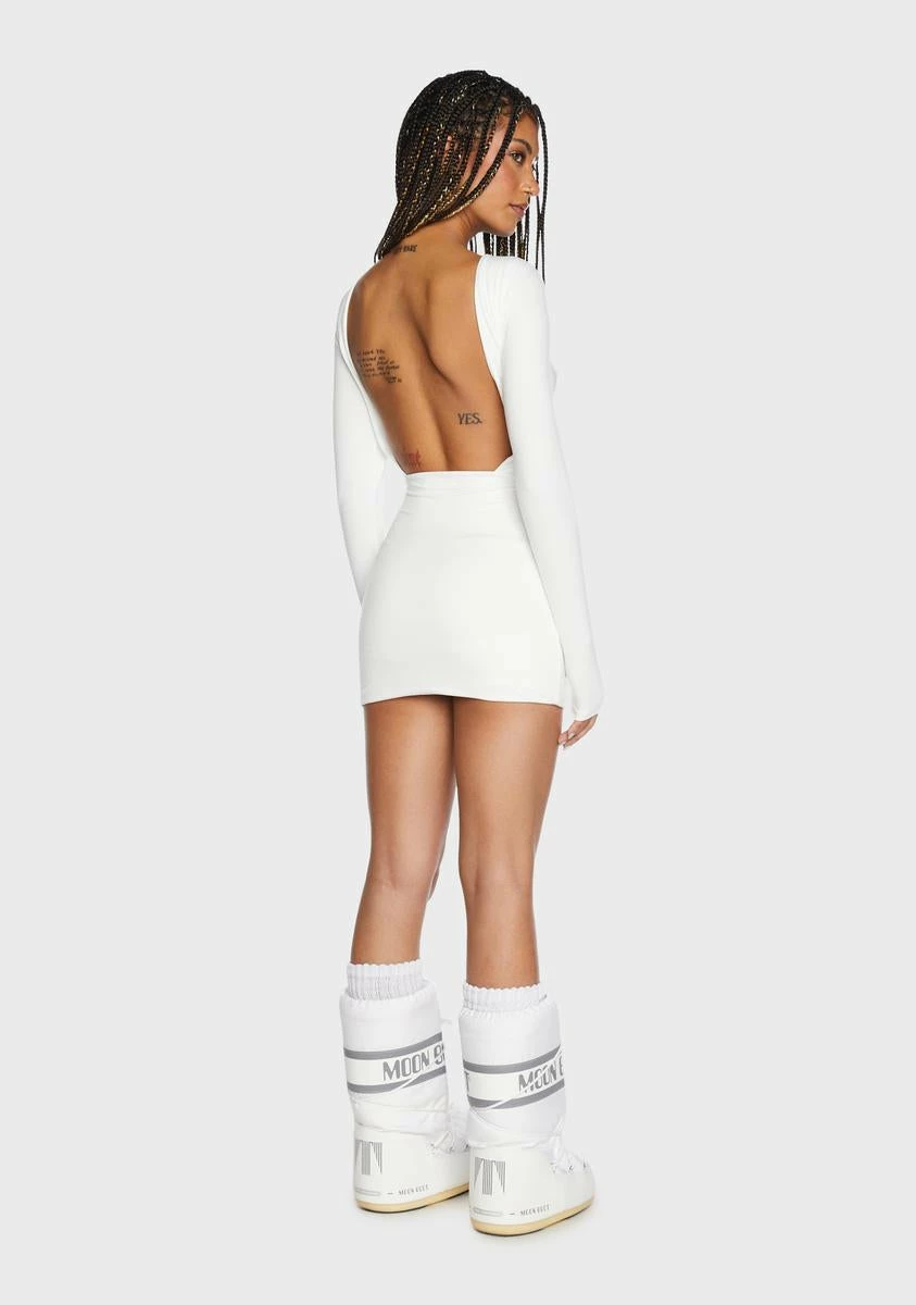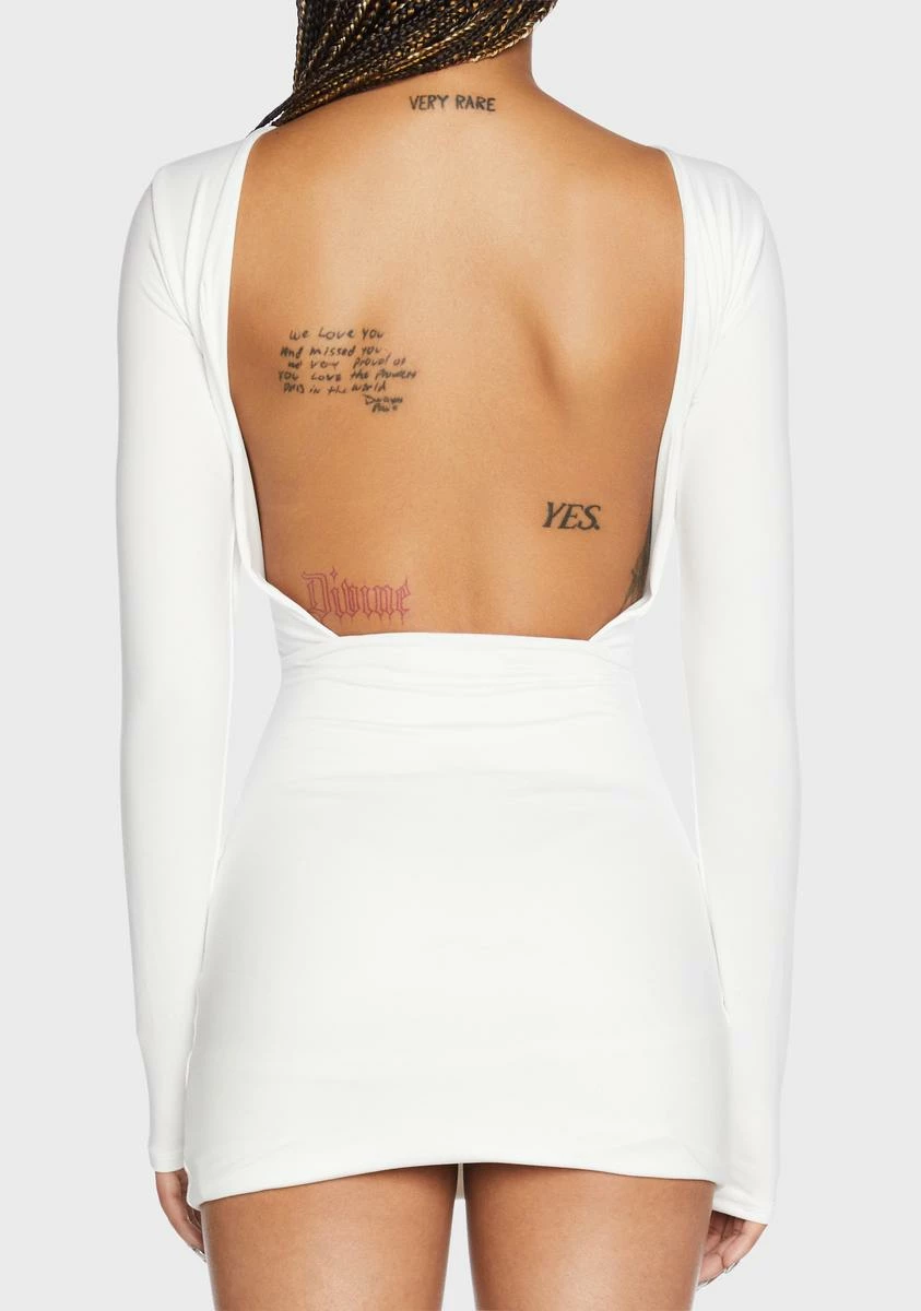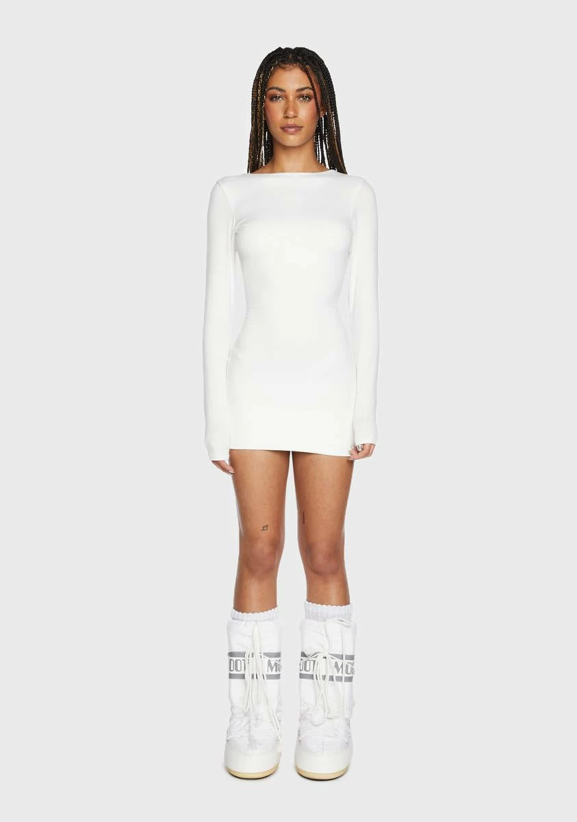 cuz you give me that feeling. This dress comes in a bodycon fit, with a wide neckline, long sleeves, and an open back.