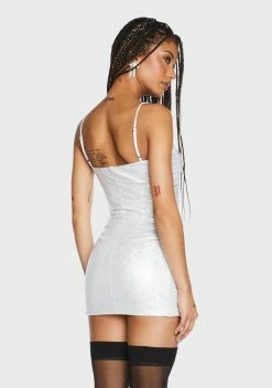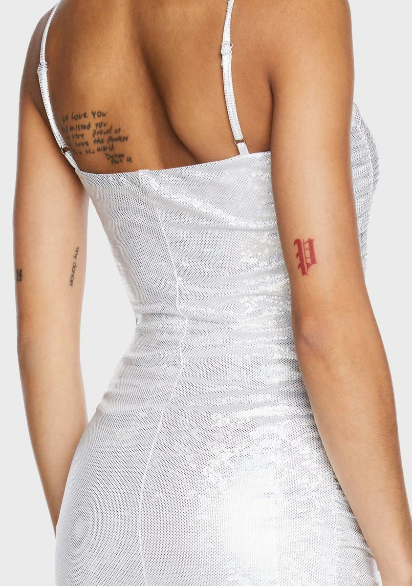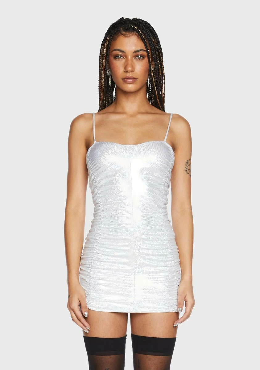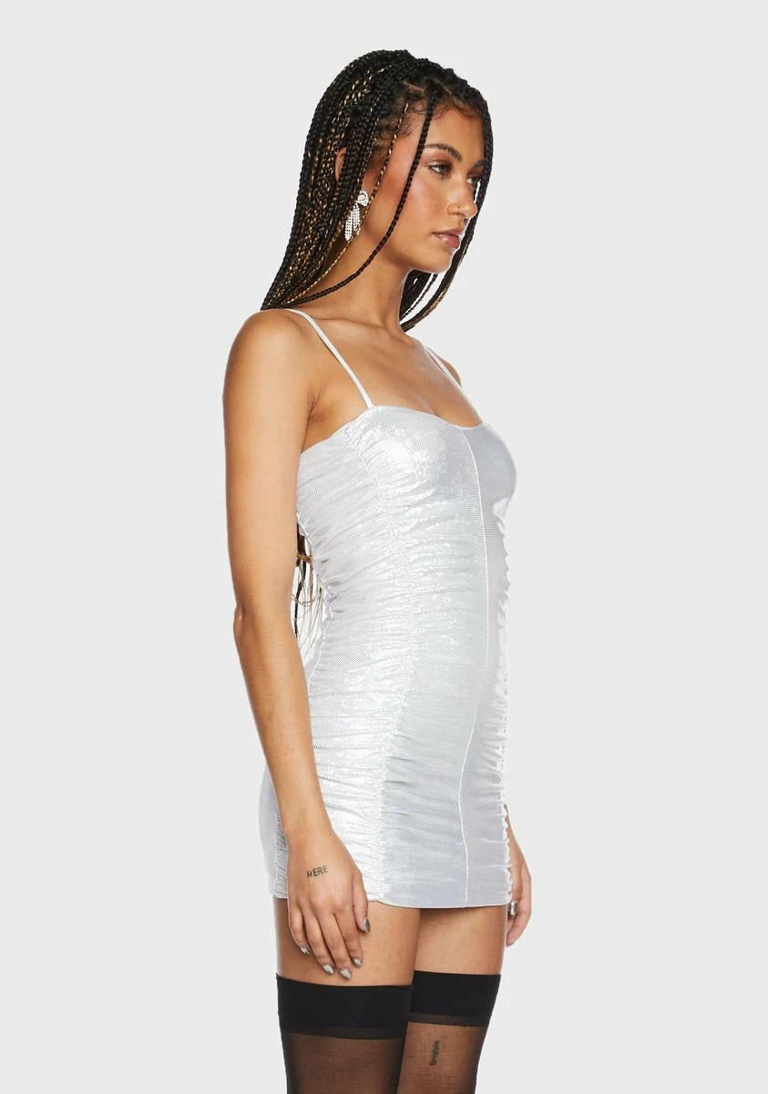 cuz you hypnotize them all. This dress has a holographic construction, a ruched design, adjustable shoulder straps, and a bodycon fit.