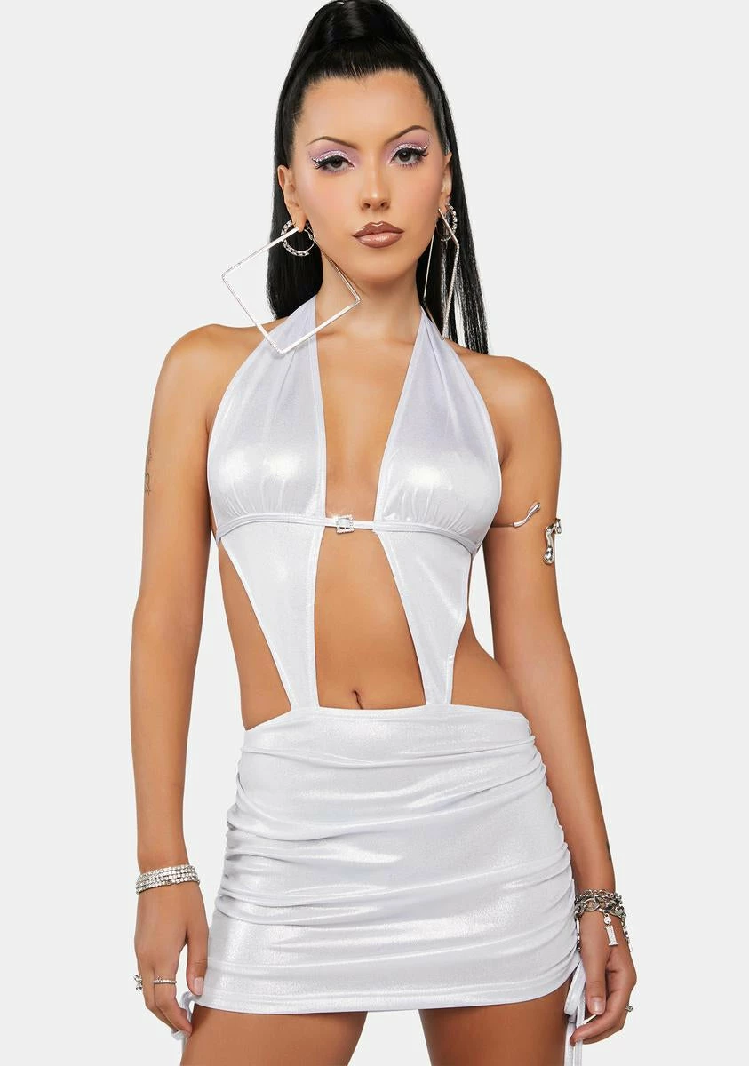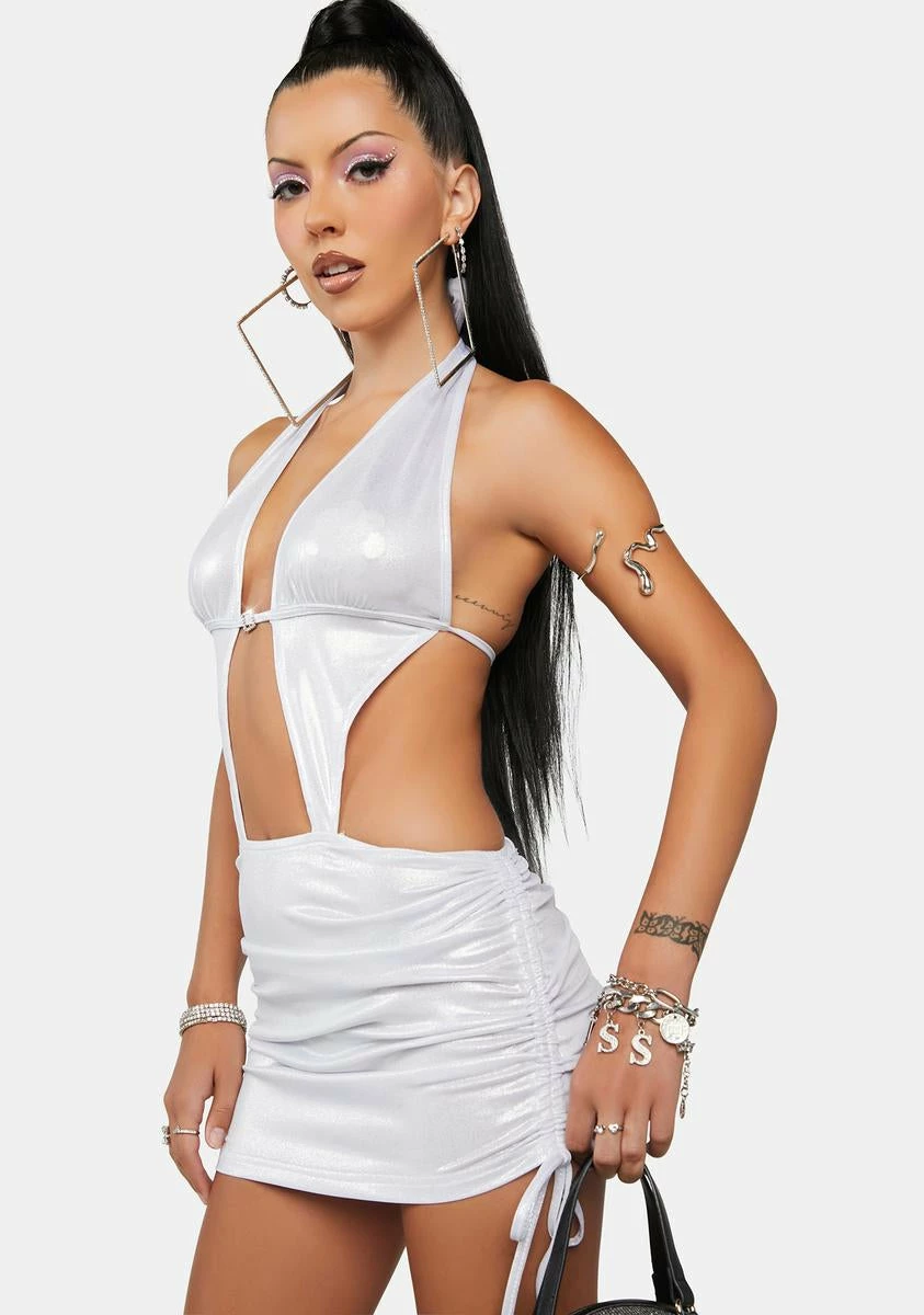 if you wanna get with me, you gotta show me what you’re worth. This mini dress has a metallic finish, a plunging neckline, halter straps, a rhinestone buckle detail, an open back design, and ruching at the hips with adjustable ties.