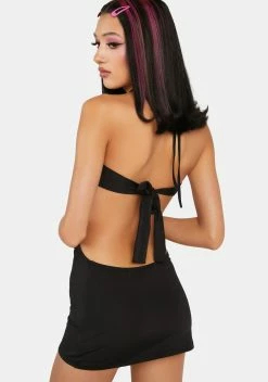 cuz kiss me on the dance floor. Be a vision in this mini dress that has a stretchy construction, a halter neckline with adjustable tie closures, a cut out design, a rhinestone heart and square shaped buckle, ruched detailing, and a bodycon fit.