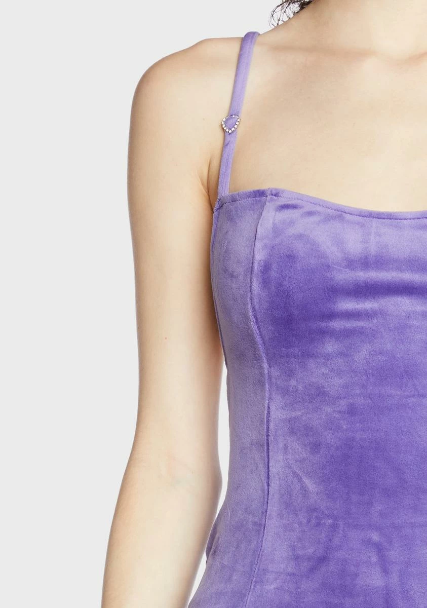 cuz you’re the name in every headline! This fitted mini dress has a velour construction, rhinestone heart details on the shoulder straps, and a low cut back.