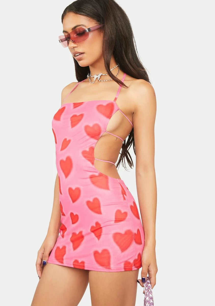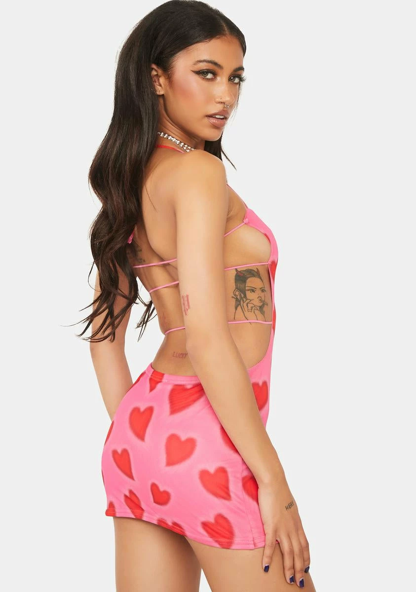 got necks breaking and hearts racing. This mini dress has a heart print all over, an open back with three thin straps, and a curve-hugging bodycon fit.