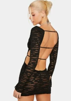 cuz it was written in the stars. This long sleeve mini dress has a semi-sheer distressed construction, a cowl neckline, an open back with adjustable thin laddered straps, and a bodycon silhouette.