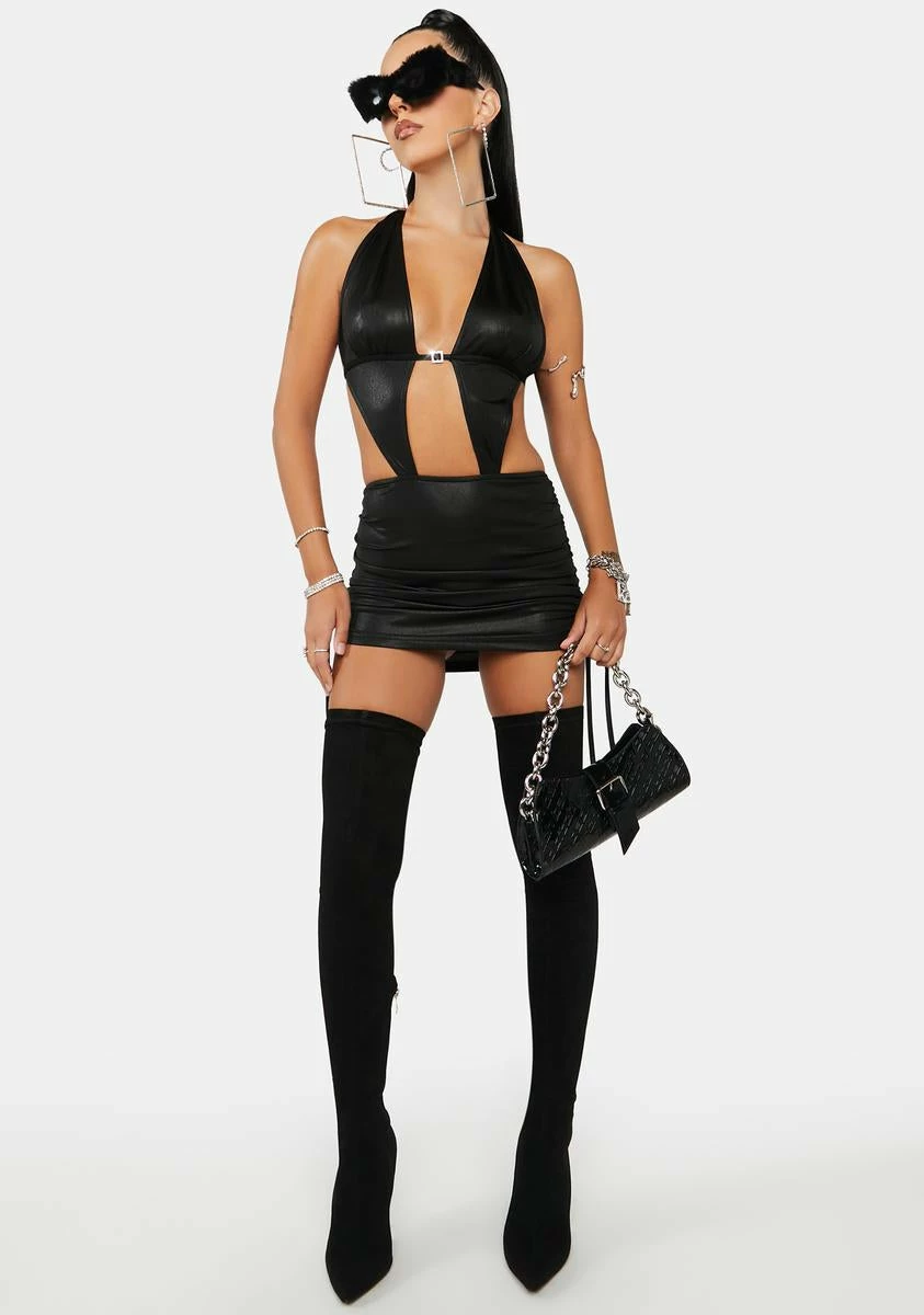 if you wanna get with me, you gotta show me what you’re worth. This mini dress has a metallic finish, a plunging neckline, halter straps, a rhinestone buckle detail, an open back design, and ruching at the hips with adjustable ties.