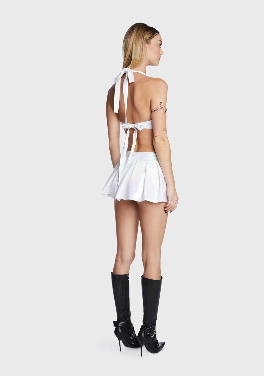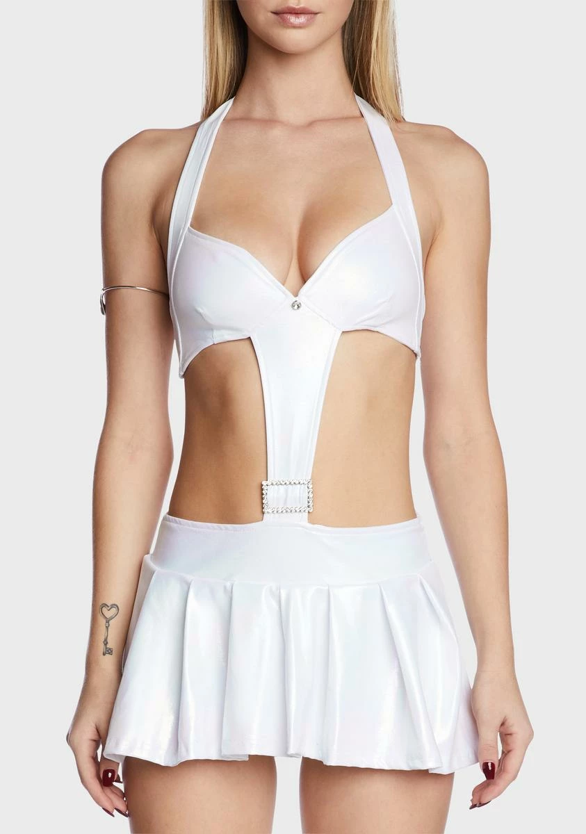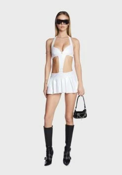 cuz you can’t fight it. This dress comes in a metallic construction, with side cut outs, a halter neck and back tie closure, a rhinestone buckle detail, and a pleated skirt.