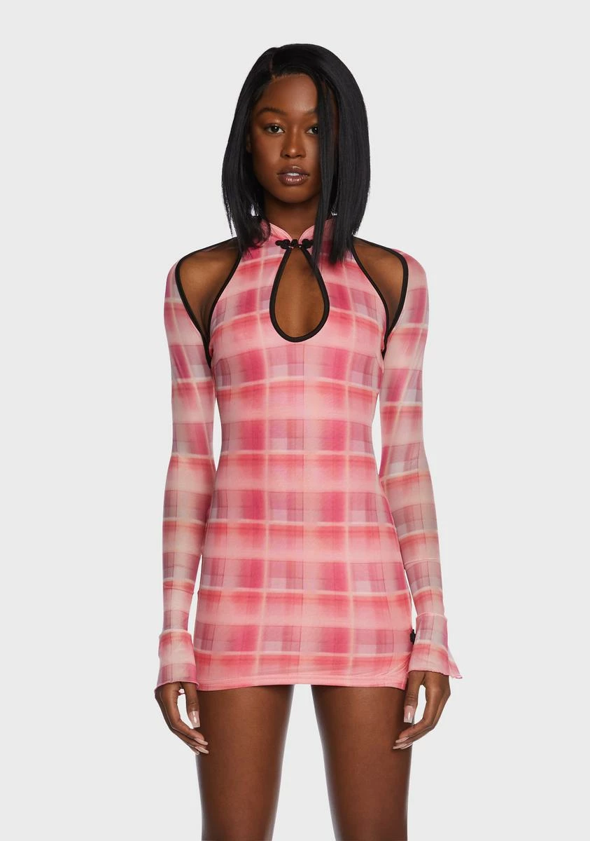 brace yourself. This dress comes in a mesh construction, with a keyhole cut out, shoulder cut outs, long sleeves, and a plaid print all over.