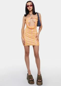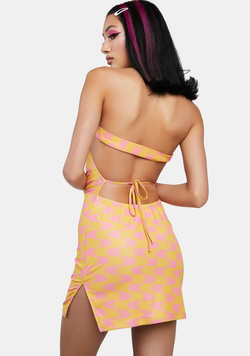 cuz the night comes and the heat remains. Make them sweat with this mini dress that has a stretchy mesh construction, an all over trippy pattern, a front cut out design, a buckle closure, a side slit, and an open back with adjustable tie closures.