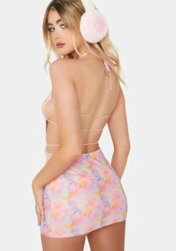cuz you’re a work of art. Look timeless and sexy with this mini dress that has an all over trippy print, a halter neckline with adjustable ties, an open back, a strappy design, and a bodycon fit.