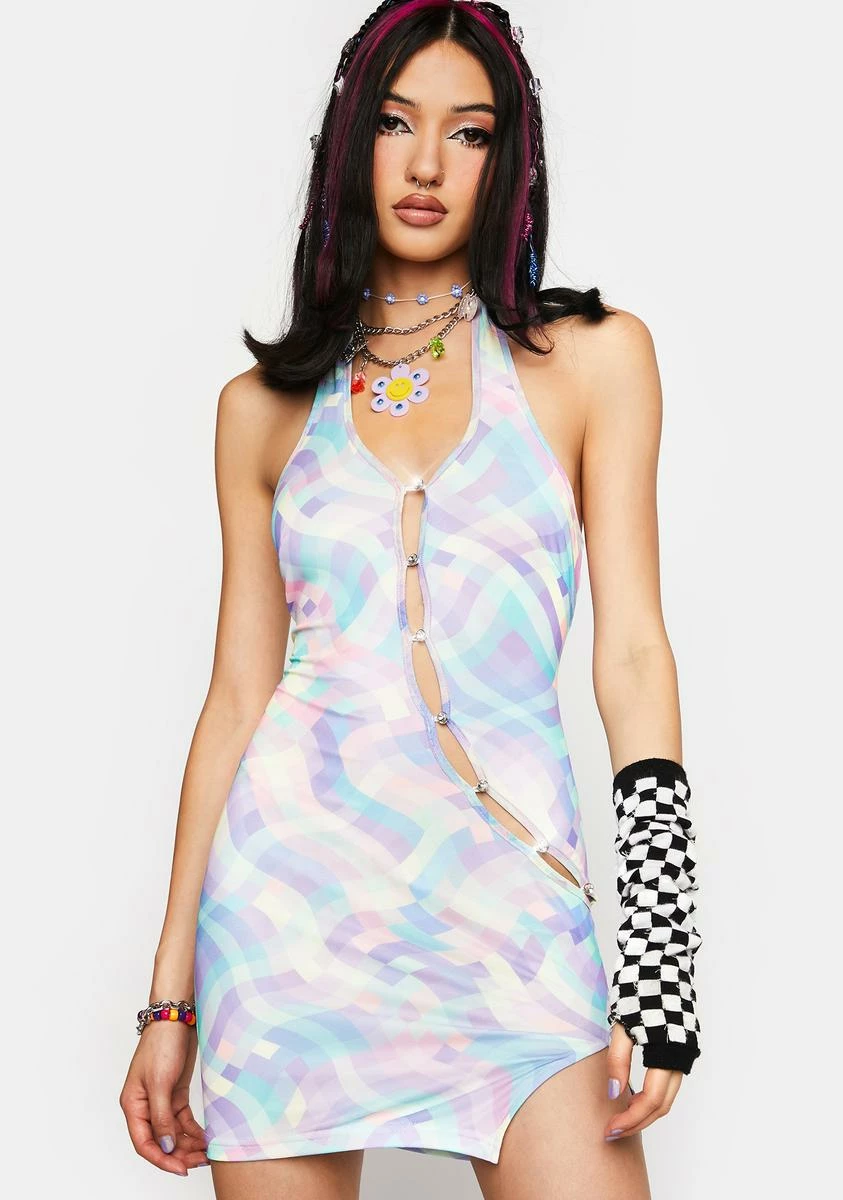 cuz they can’t even compete. This mini dress comes with a halter neck strap, cut out details with rhinestone button closures, a back zip closure, slit detail, and an abstract print all over.