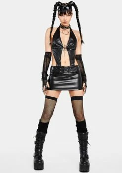 cuz you notice them noticing you. This mini halter dress has a slightly stretchy vegan leather construction with cut-out designs, adjustable tie back closures, a plunging neckline with mini O-ring hardware, a belted detail on the waist, and a back zip closure.