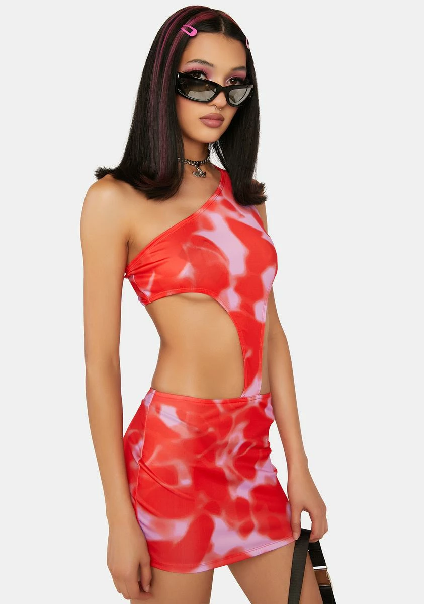 cuz no one can put your light out. This asymmetrical mini dress has a blurred abstract print all over, a stretchy construction with a hint of sheen, a one-shoulder neckline, cutouts at sides and back, and a bodycon fit.