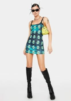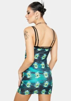will have ’em buggin’ out! This mini dress has a stretchy bodycon fit, adjustable shoulder straps, and a digital bug print all over.