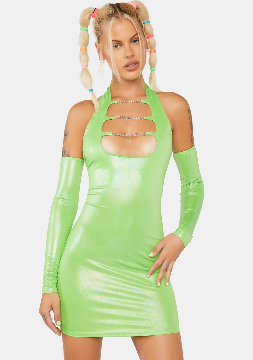 feel that music, babe! This bodycon mini dress has a metallic finish, cut-out details with chain hardware, and detachable sleeves.
