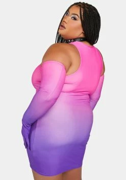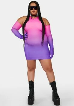 that’s when the party starts. This mini dress comes in a stretch construction, racerback fit, ombre print, with matching gloves.